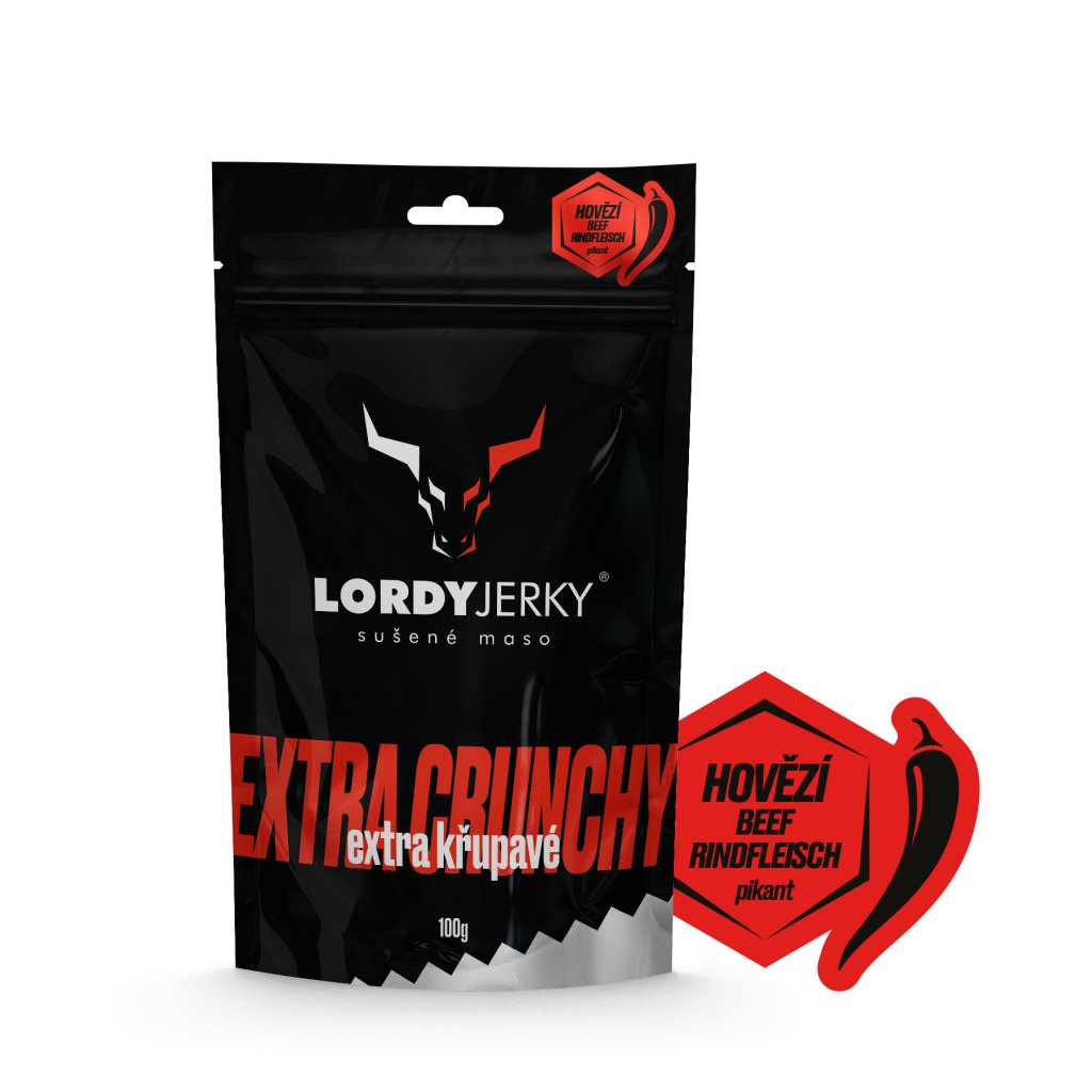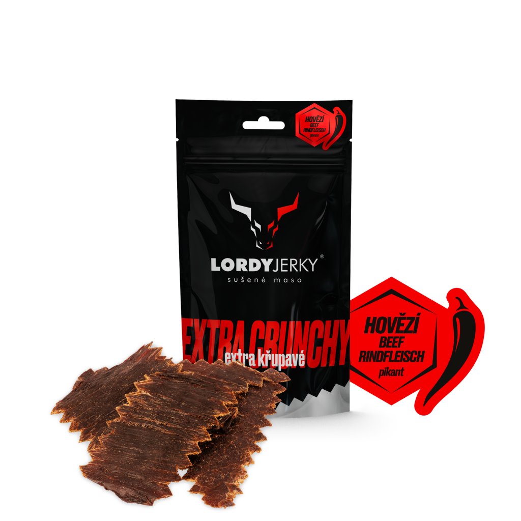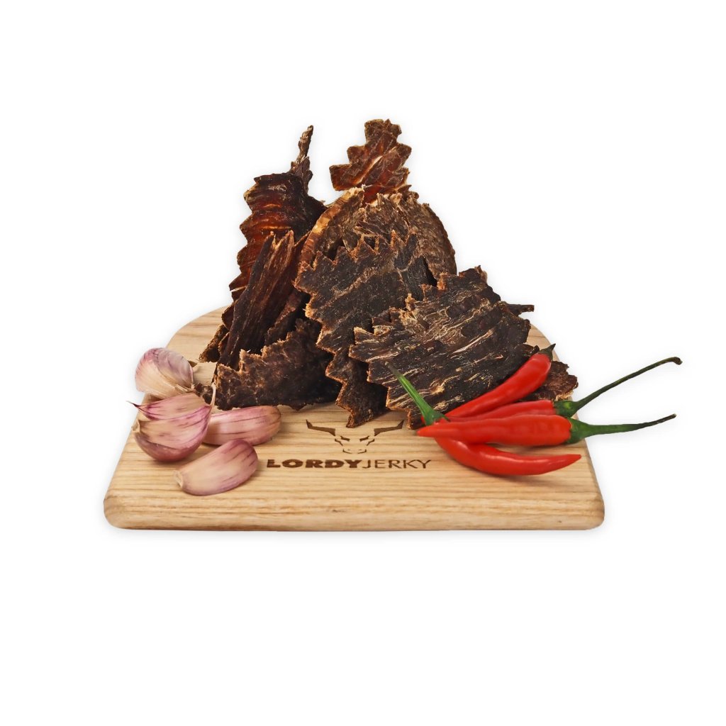 LORDYjerkyⓇ – marinované sušené hovězí maso s chilli. Masný výrobek trvanlivý tepelně opracovaný.